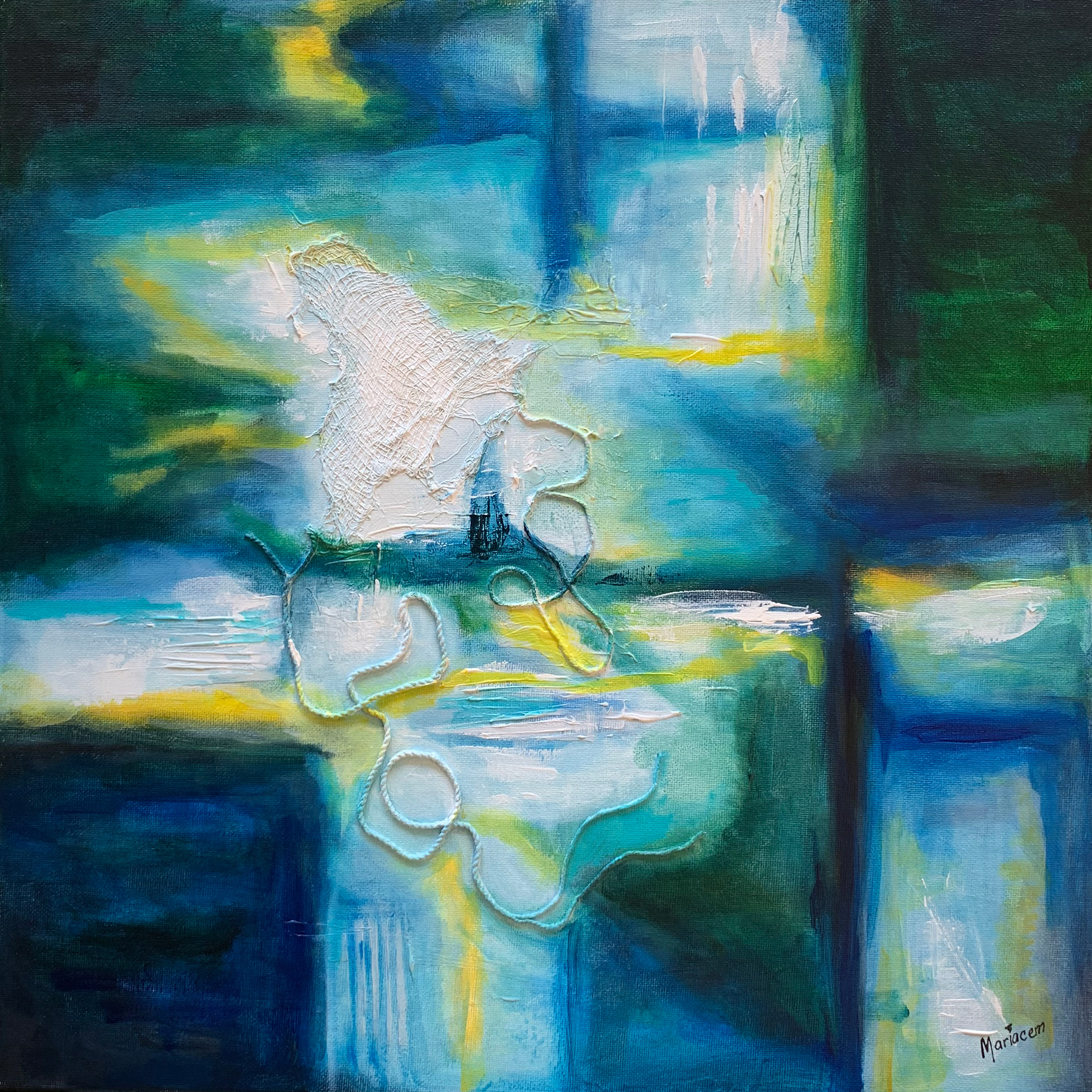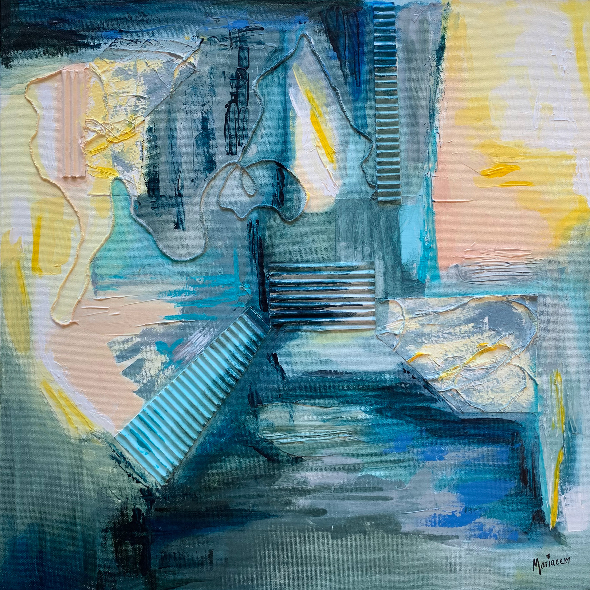 Collage in Blue I. Acrylic on canvas. 24 x 24 inches.